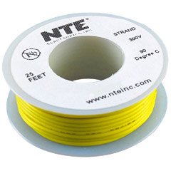 NTE stranded 24 AWG yellow hook-up wire for point-to-point wiring is perfect for internal, 300 V, point-to-point wiring of electrical and electronic equipment, meters, computers, business machines, appliances and control panels. Specifications: • Length: 25 ft. spool • Conductor gauge: 24 AWG • Conductor: Stranded tinned copper • Strand count: 7 • Insulation: Color-coded PVC • UL style: 1007 • CSA: TR-64/1569 • Passes UL VW-1.S vertical flame test • Operating temp: -55 ~ + 90° C • OSHA acceptable.