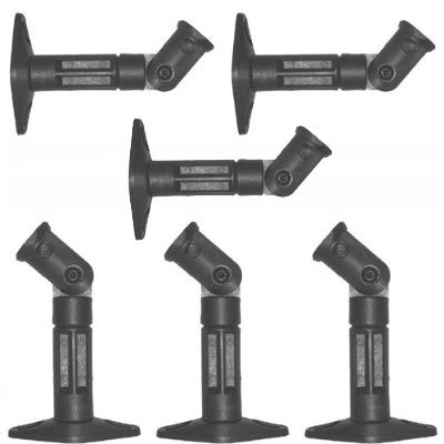 These brackets are also available in WHITE and in packages of 2, 3, 4, 5, or 6 brackets. Ideal for mounting home theater satellite speakers on walls or ceilings; Supports speakers weighing 8 pounds or less; Made of durable, weather resistant, injection molded fiber resin reinforced polymer; Multiple tilt and swivel pivot points allow perfect directional speaker aiming; Designed to fit all home theater satellite speakers with one threaded mounting hole, two threaded mounting holes or keyhole mounting systems; All mounting hardware is included. There is no need to purchase additional hardware items. Technical Details: Total product length (wall mount applications): 3.25 inches. Total product length (ceiling mount applications): 5.5 Inches. Designed to fit the following brands of home theater satellite speakers: Bose, Denon, Infinity, Insignia, Kenwood, LG, JVC, Onkyo, Panasonic, Philips, Pioneer, Samsung, Sony, Yamaha, Zenith and most other brands of satellite speakers. Included Items: 6 Mounting brackets, ceiling extensions, allen wrench, instruction sheet as well as all adapters and hardware necessary to connect your speakers to the brackets and the brackets to the wall or ceiling.
